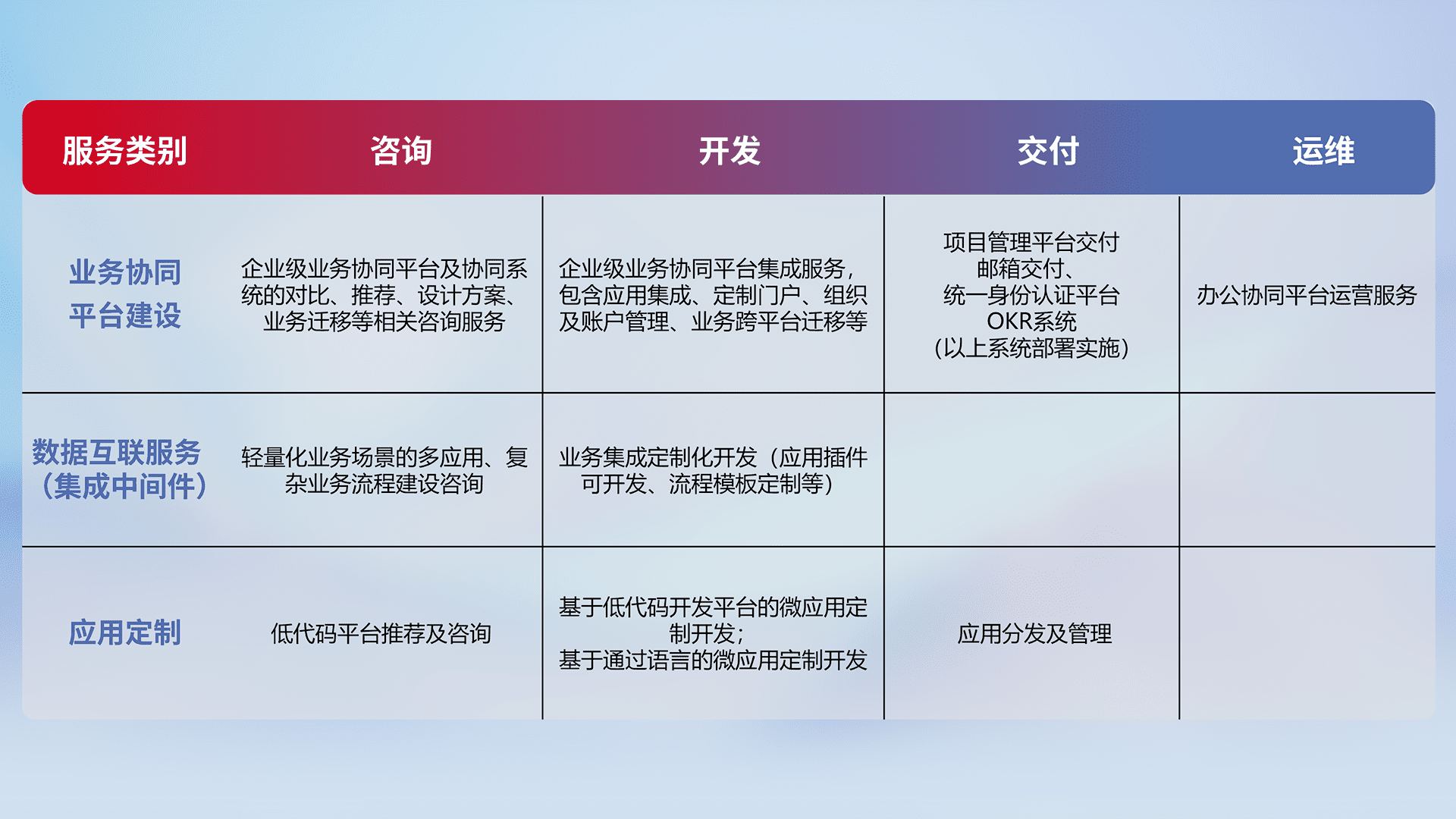 针对钉钉、、企微、、、、IDaas等平台级产品提供产品的规划、、方案、、、、交付、、、定制化开发等服务,,实现如统一协同办公、、智能客户服务、、、混合会议管理、、智能数据查询、、、、等业务场景,,,实现数字化转型。。。。